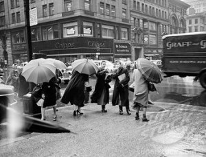 I remember those boots the women are wearing. My grandmother had some. They slipped over the shoes, were transparent and had a one button closure.