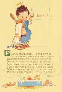Hung across from the toilet in our bathroom when I was young was a picture of a little boy just getting ready for his bath. He carried a brush, soap and a towel and had a halo over his head. His bathrobe was blue and was fuzzy the way old cards and books sometimes were. Santa’s red suit was often fuzzy in the same way. I used to sit and read the verse on that picture. I read it so many times I can still recite from memory. In a B&B in Ireland that same picture with the fuzzy bathrobe hung in the bathroom. I tried to buy it, but the woman didn’t want to sell it. When I got home, I googled the verse and found a metal reproduction. I really wanted fuzzy, but I bought the metal one anyway for my mother’s stocking. She couldn’t believe I remembered it let alone found one. It hung in her upstairs bathroom. Now I have it hanging in mine. The verse, by Mabel Lucie Attwell, starts “Please remember don’t forget, never leave the bathroom wet…”