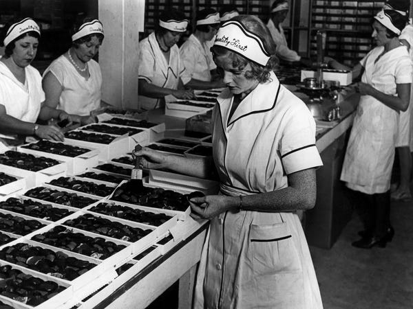 This picture reminds me of Lucy and Ethel working on the candy production line in an I Love Lucy TV episode. In those days the TV network standards board wouldn’t let the writers refer to Lucy’s condition as pregnant. You couldn’t even use the word in reference to a pregnant pause.