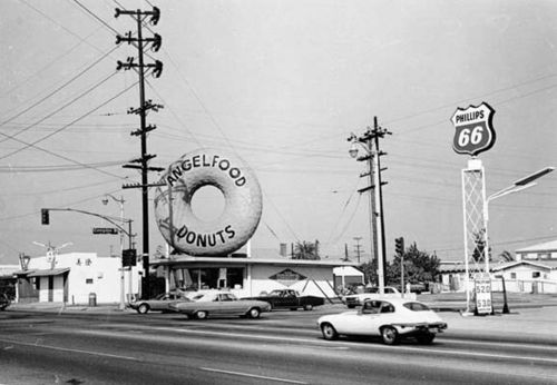 The Jaguar XKE on the street gives a good idea that this picture is from the 1960s. Donuts are still wonderful. They are filled with the necessities of life, fat, sugar and calories. 🙂